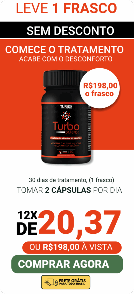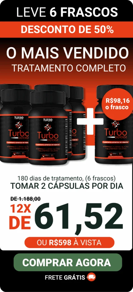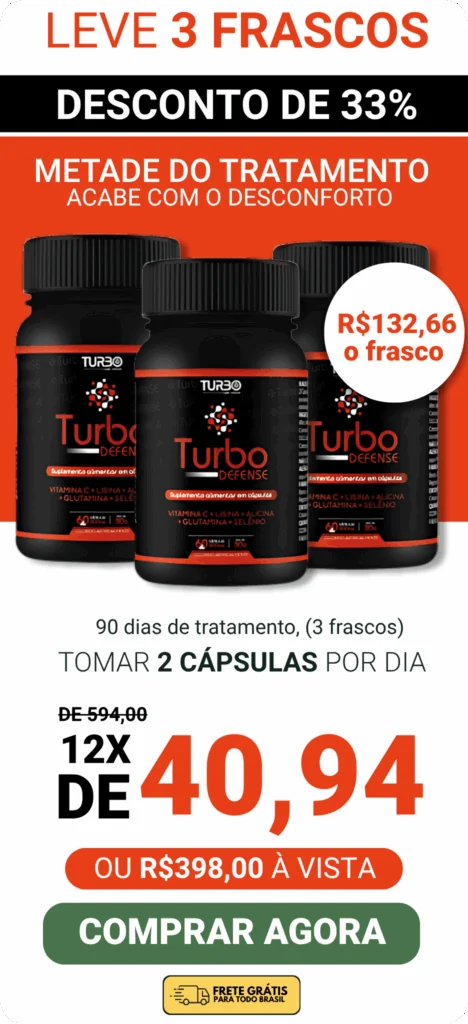 TURBO DEFENSE é o único tratamento que começa a eliminar os sintomas da herpes em até 72h, graças à potente combinação de Selênio, Glutamina Ajinomoto Co e Lisina. Uma solução rápida e eficaz para combater a herpes e prevenir surtos futuros.